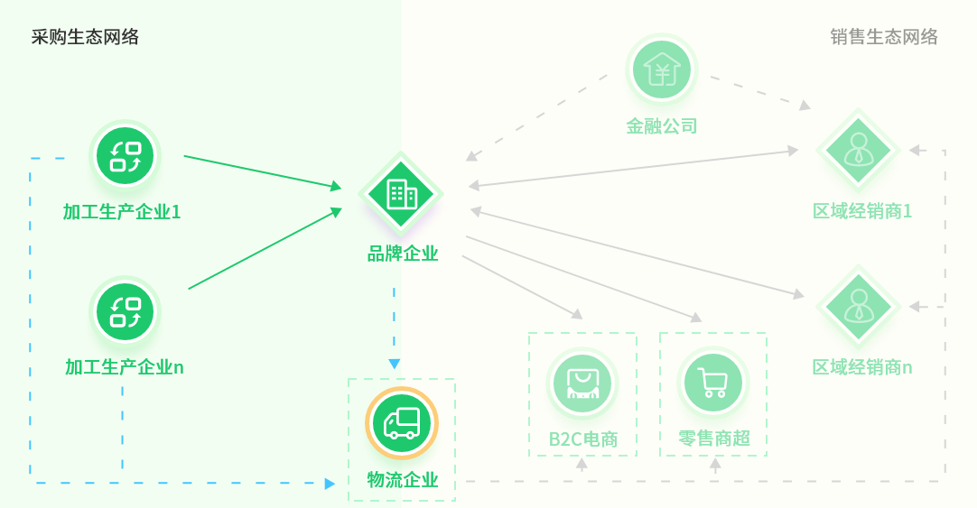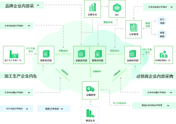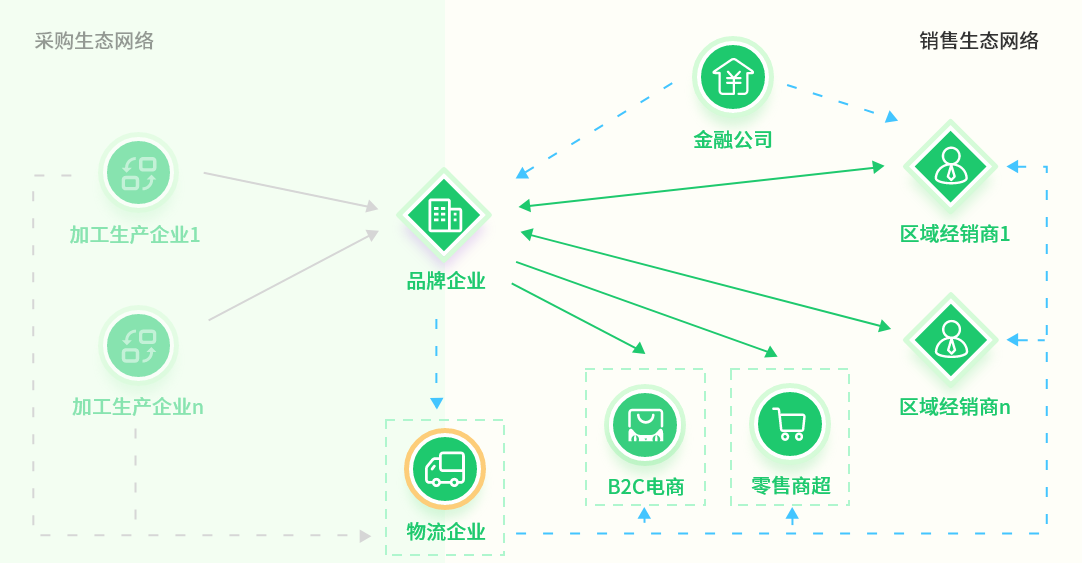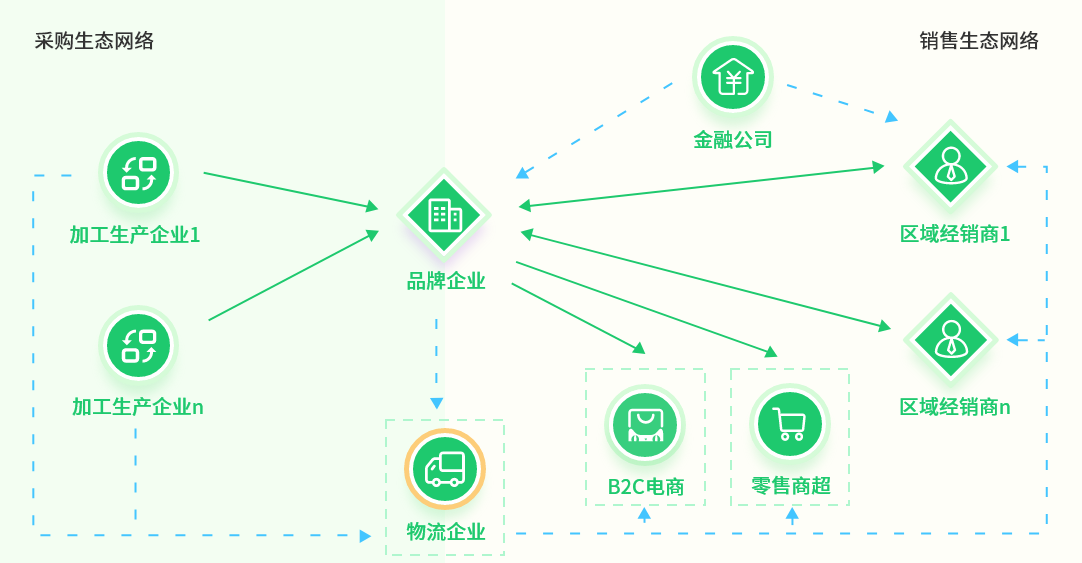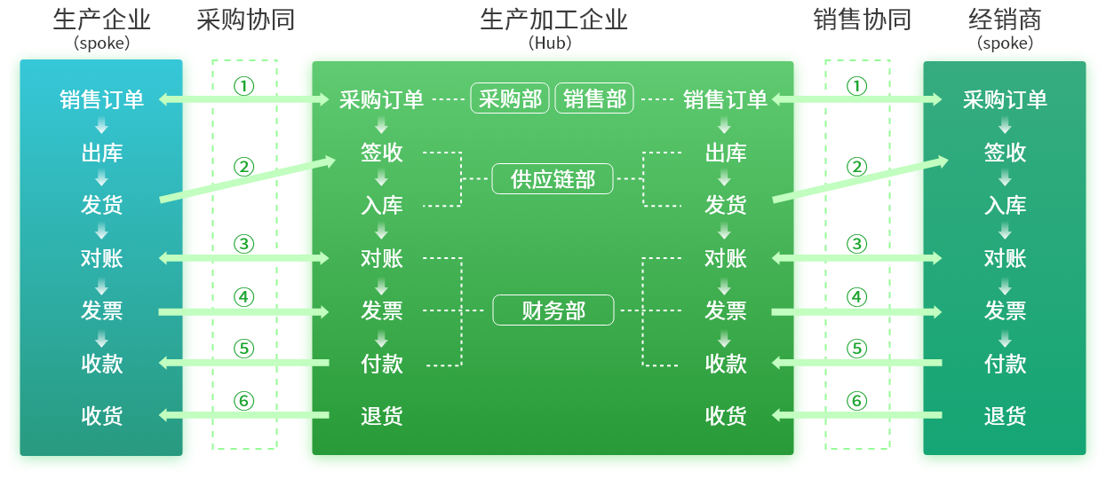 品牌企业(Hub)通过上平台协同业务,实现业务订单全生命周期管理和数据可视化。同时可以根据上游加工企业(spoke)和下游经销商(spoke)信息化协同意愿进行场景配置