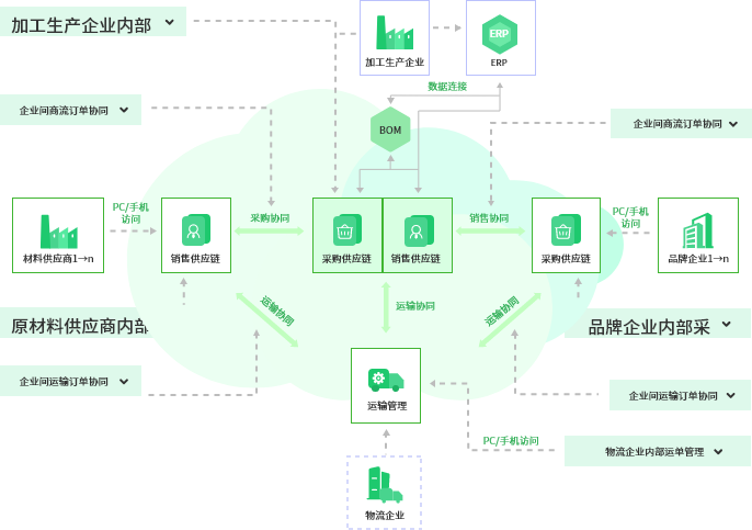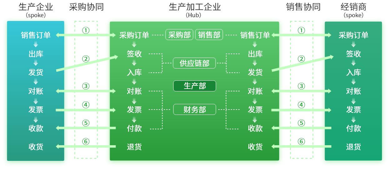 生产加工企业(Hub)通过上平台协同业务,实现业务订单全生命周期管理和数据 可视化。同时可以根据上游原材料供应商(spoke)和下游OEM品牌商(spoke)信息化协同意愿进行场景配置